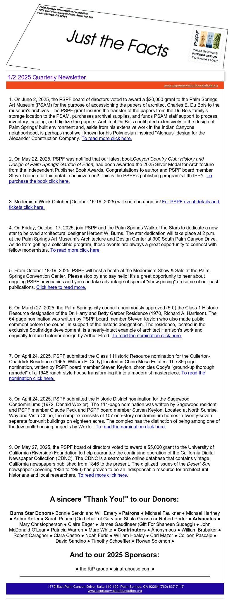 On October 21, 2020 the California Preservation Foundation recognized PSPF with its “2020 President’s Award for Advocacy.” Palm Springs mayor Geoff Kors made a surprise appearance during the virtual awards ceremony to congratulate PSPF.